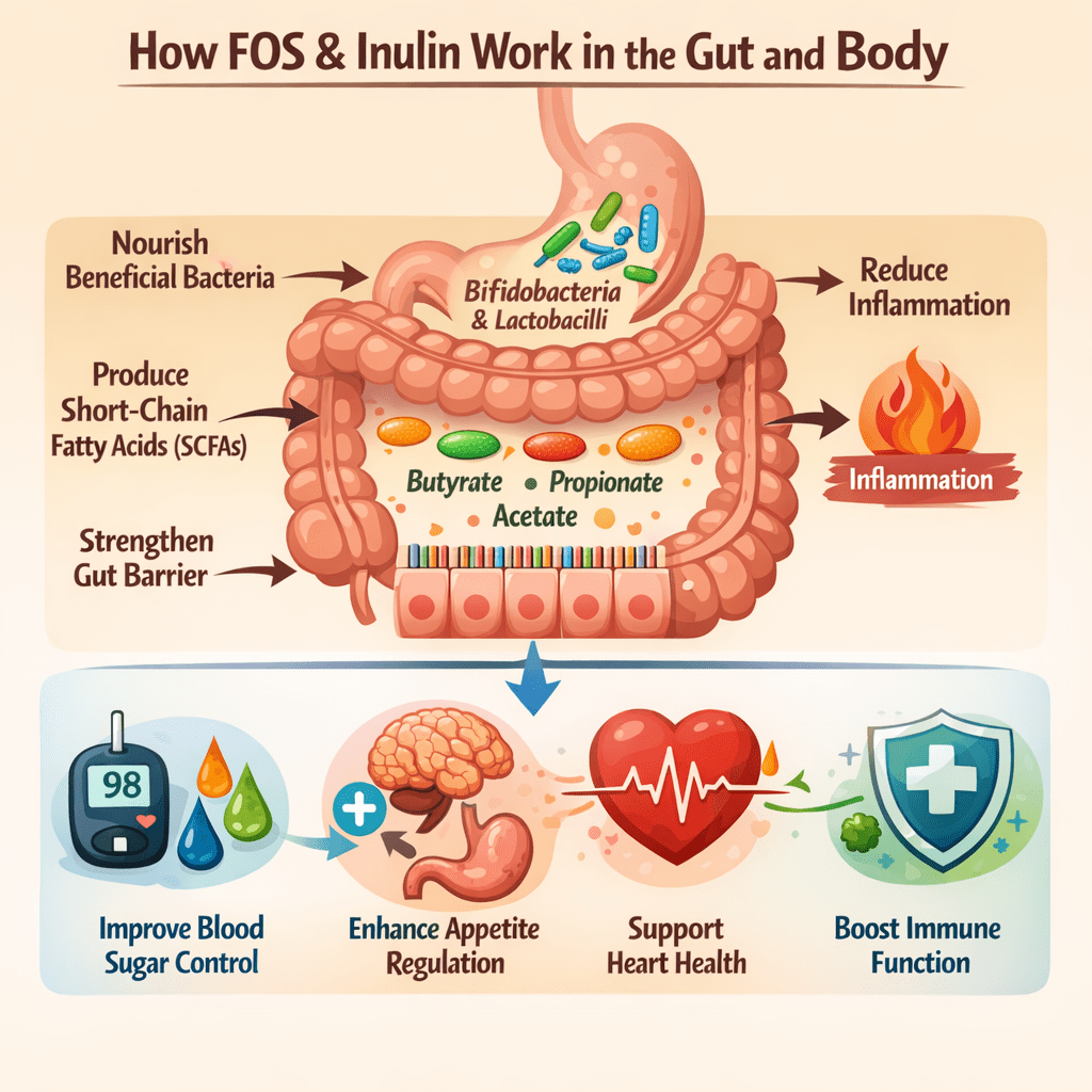 FOS and inulin are prebiotic fibers—they bypass human digestion and selectively feed beneficial gut microbes. In doing so, they influence: